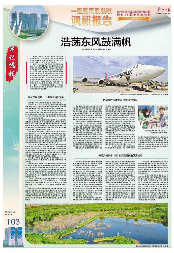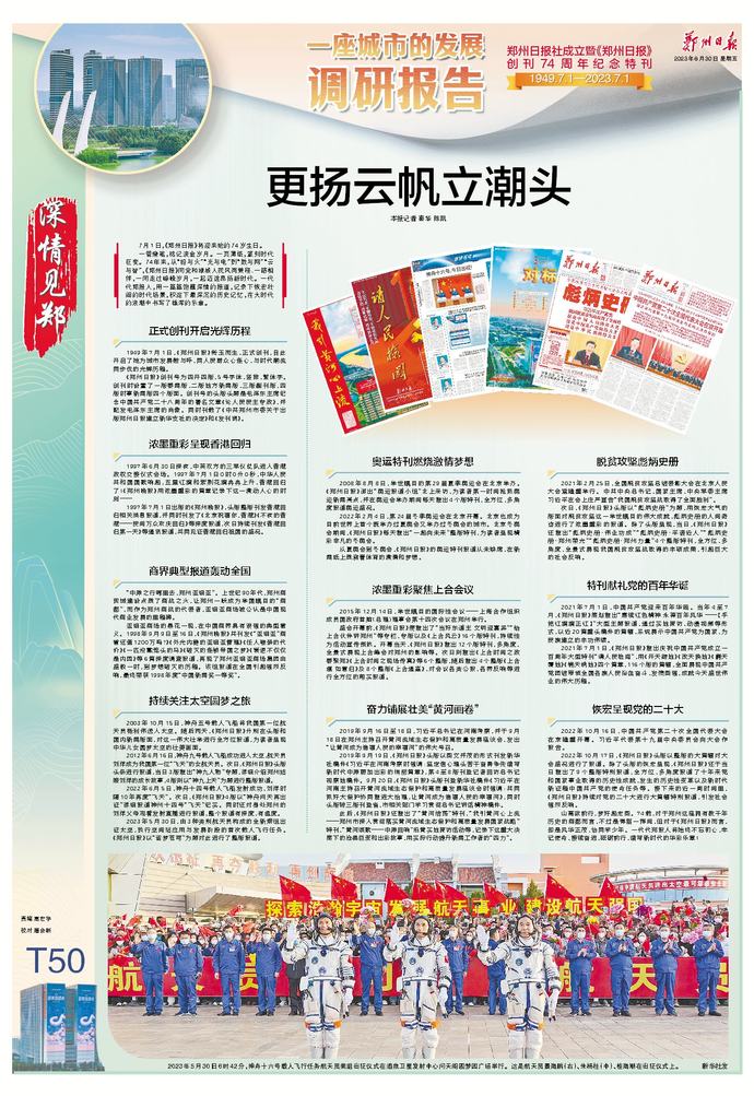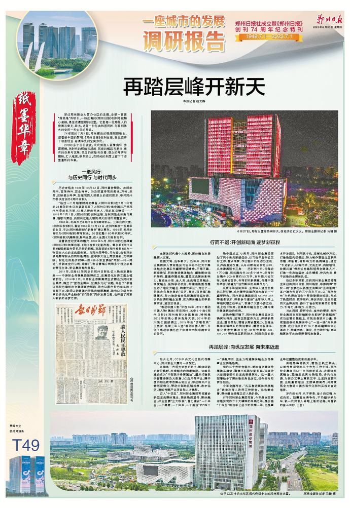 當2023年7月1日的第一縷陽光穿破云層映入你的眼簾,當你打開這一天的《鄭州日報》,你看到的,是一條條新聞,看不到的,是這張74歲的報紙背后,27000多天不曾間斷的新聞推送、是一代代新聞人挺膺在前的責任、是一個個新聞工作者用腳“丈量”城市后用心書寫的文字,更是屬于這個時代的、這座城市的“調研報告”。