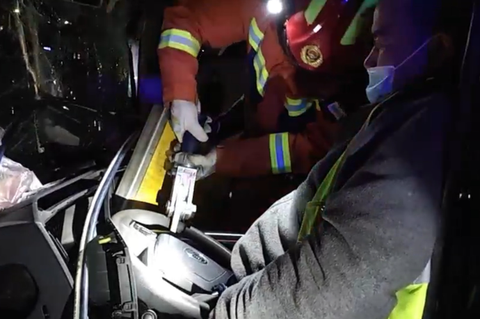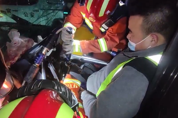 凌晨2時42分,消防救援人員到達救援現場,得知現場為后方貨車因道路結冰路滑而追尾前方貨車,事故致使后方貨車駕駛艙受損,駕駛員在撞擊中下肢被卡被困駕駛位。