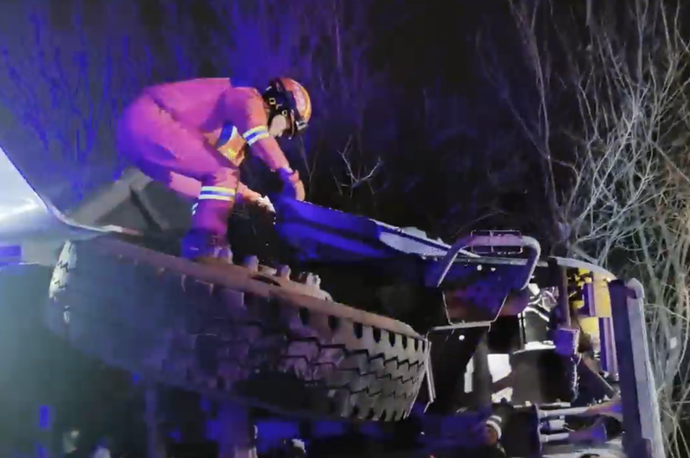 當日凌晨3時,貨車駕駛員被新鄭市消防救援大隊成功救出,隨后被4名消防員快速轉移至安全地帶進一步檢查救治。