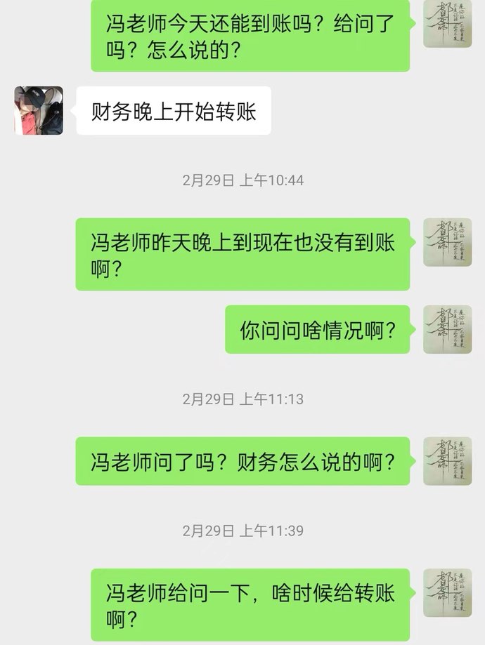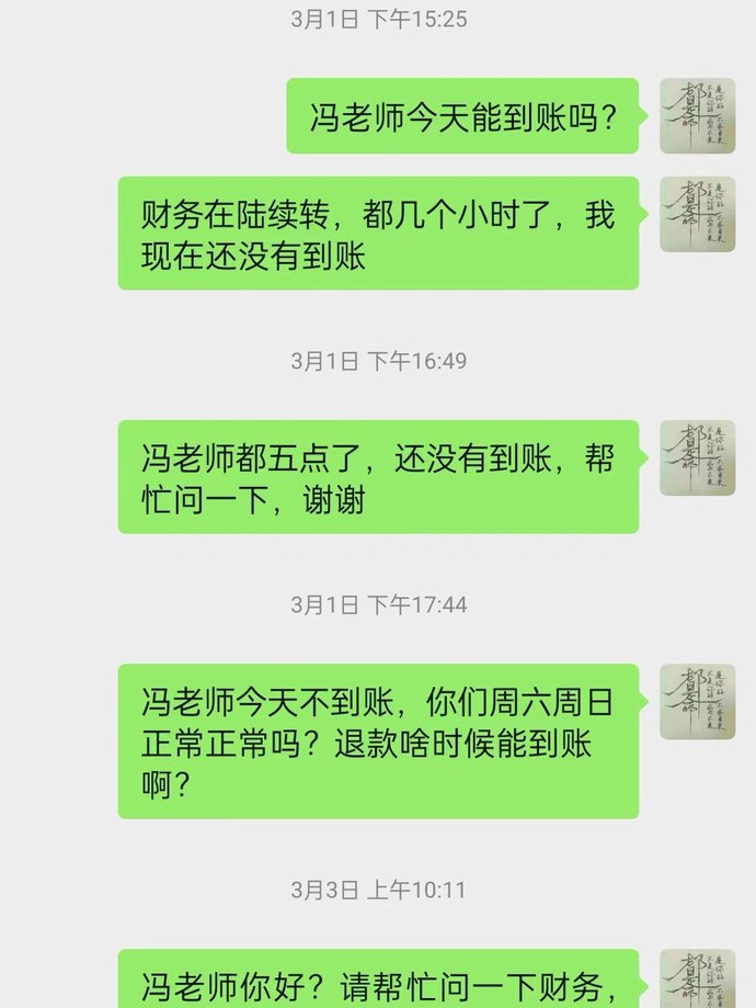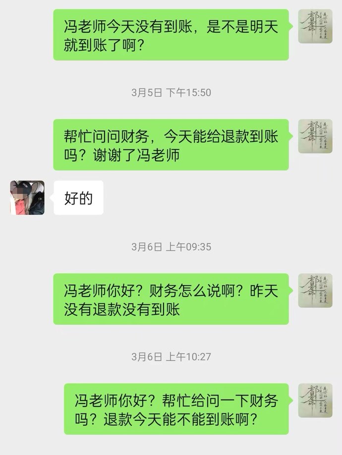 2024年2月中旬至3月下旬,鄭先生多次催問退費流程是否走完,教務先是回復審批已通過,但費用到賬需要等一段時間,“催的多了,微信不回、電話不接、短信不回,不能說完全失聯,但也是在拖延。”