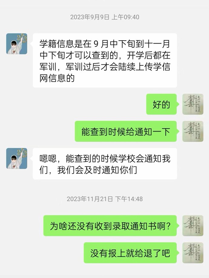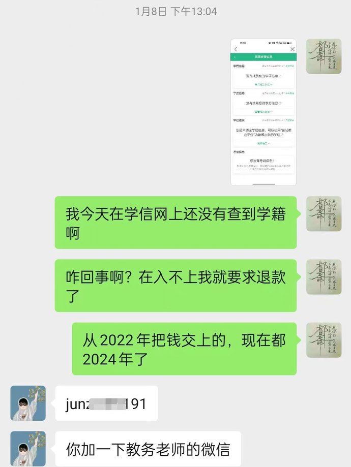 2023年9月9日,鄭先生因未查詢到學歷信息更新而咨詢公司客服,對方稱“開學后都在軍訓,軍訓過后才會陸續上傳學信網信息”。11月21日,鄭先生催問稱未收到錄取通知書,要求“沒有報名就退費”,對方又稱12月10日可查到信息。