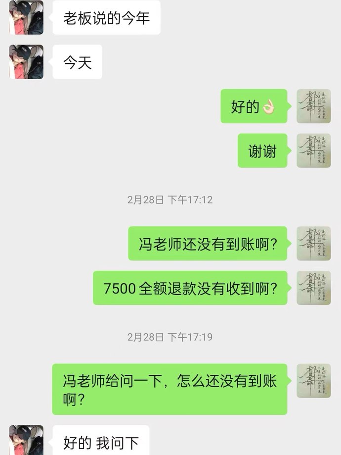 2024年1月8日,鄭先生仍未查詢到新的學歷信息,他與教務老師溝通后開始等待“20個工作日全款到賬”。2月18日,因退款未到賬,他再次催問并拒絕了對方“變更合同優先錄取”的建議,堅持等待“月底正常退費”,但對方稱可以退回7500元,但退費需要走審批流程。