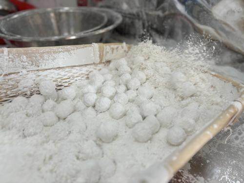 臨近元宵節,位于汝河路上的老西郊周記手工石磨元宵開啟了忙碌的節奏。只見元宵師傅將餡料蘸水后放入盛著干糯米粉的笸籮中反復推搖,經過多次的蘸水、沾粉后,元宵初具雛形,最后再放入機器中均勻裹粉并確認元宵的個頭兒達標后,一顆顆飽滿的元宵才算“滾”制而成了。