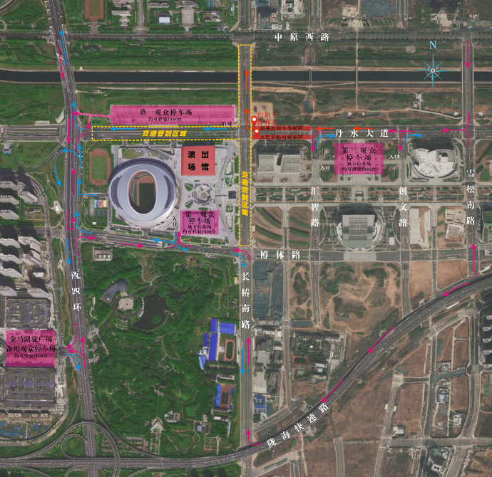 設在奧體中心北側建成停車場,約可停放小型車1300臺。觀眾車輛經隴海西路—西四環—西四環與丹水大道交叉口東北角停車場西入口駛入停車場(車輛進入停車場后,按照管理人員指揮進入指定位置停放);退場時,車輛出停車場東門—經丹水大道向西—西四環向北駛離活動現場。
